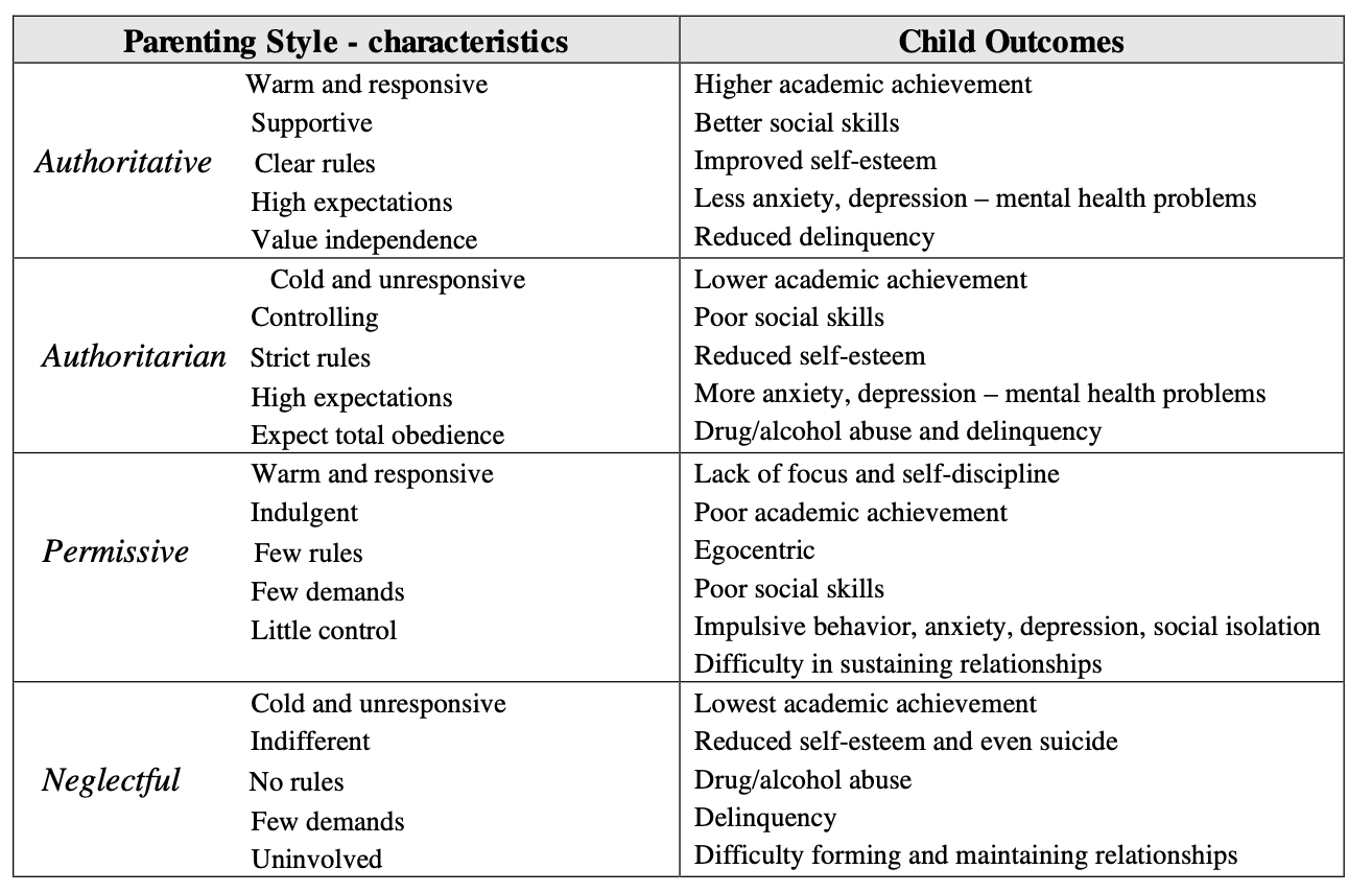 Research found that authoritative parenting towards children results in better academic achievement, stronger self-esteem, better social skills, fewer behavioral problems in school, and lower risk of anxiety and depression (Awiszus, A. et al., 2022).